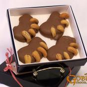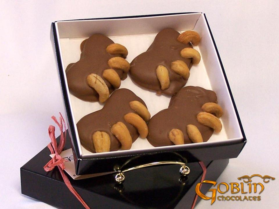 A caramel and cashew pad, wrapped in milk or dark chocolate, completed with cashew claws.