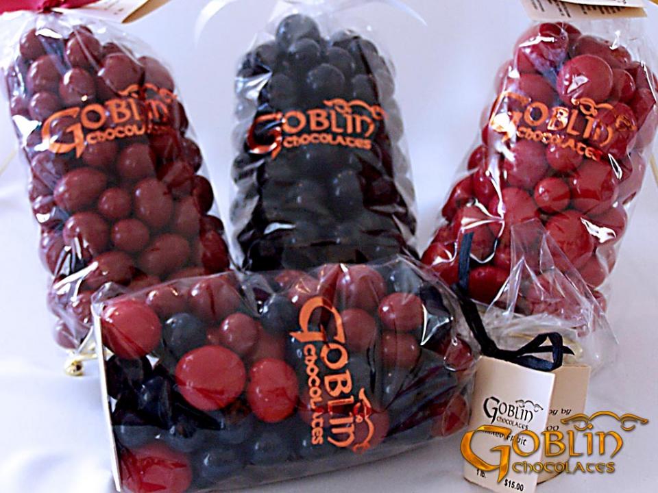 A colorful confection of dried blueberries, cherries, or cranberries coated in rich milk chocolate.